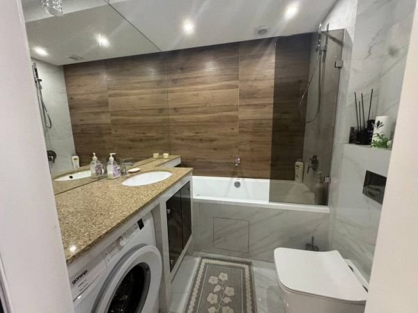 | Number of rooms | 2 bedroom apartment | | Floor | 3 | | Number of floors | 4 | | Area ( m2 ) | 68 | | Kitchen area ( m2 ) | 15 | | New building |  | | Condition of the apartment | high quality renovation | | Bathrooms | 2 | | Additionally about the house (where the apartment) : | Parking, lift, protection, concrete floors, good transport interchange, developed infrastructure, | | Information about the apartment | PVC Windows, kitchen-Studio, air conditioner(s), intercom, floor heating, water heater, washing mashine, fitted kitchen, furniture, branded sanitary ware, õîëîäèëüíè, |