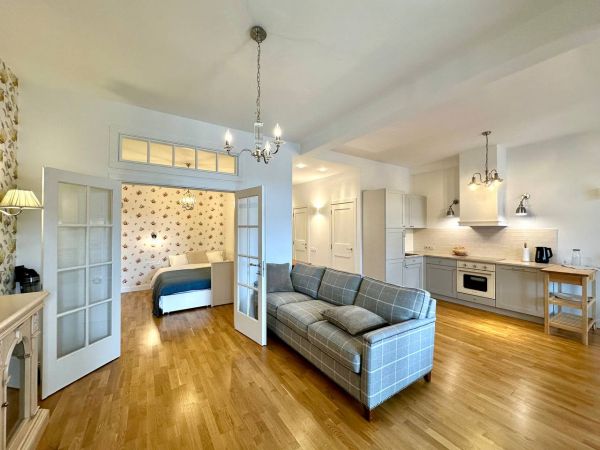| Number of rooms | 1 bedroom apartment | | Floor | 5 | | Number of floors | 12 | | Area ( m2 ) | 52 | | Living space ( m2 ) | 25 | | Kitchen area ( m2 ) | 12 | | New building |  | | Exterior walls | the red brick house | | Condition of the apartment | high quality renovation | | Bathrooms | bathroom with toilet | | Balcony | 1 | | Additionally about the house (where the apartment) : | lift, protection, concrete floors, good transport interchange, developed infrastructure, | | Information about the apartment | PVC Windows, kitchen-Studio, armour door, air conditioner(s), floor heating, water heater, washing mashine, fitted kitchen, furniture, branded sanitary ware, õîëîäèëüíè, |